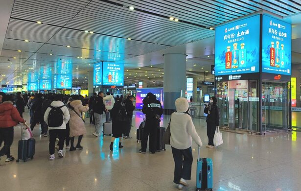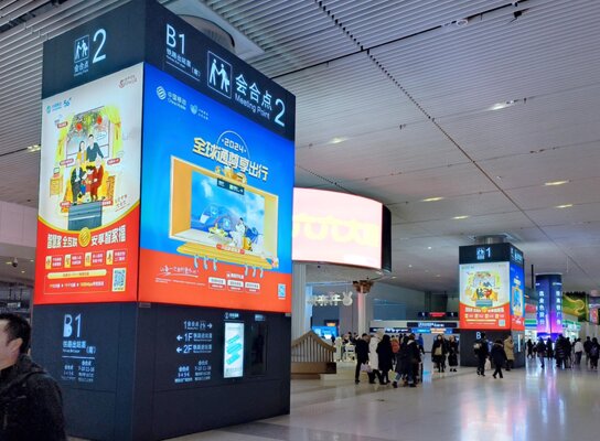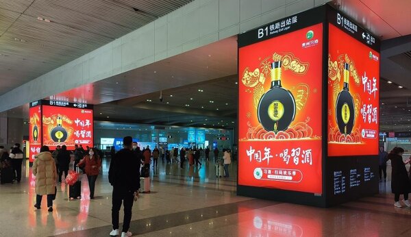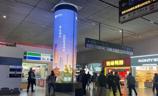 | 西安北高鐵站廣告案例圖-魔方柱 | 候車區(qū)-魔方柱刷屏 |